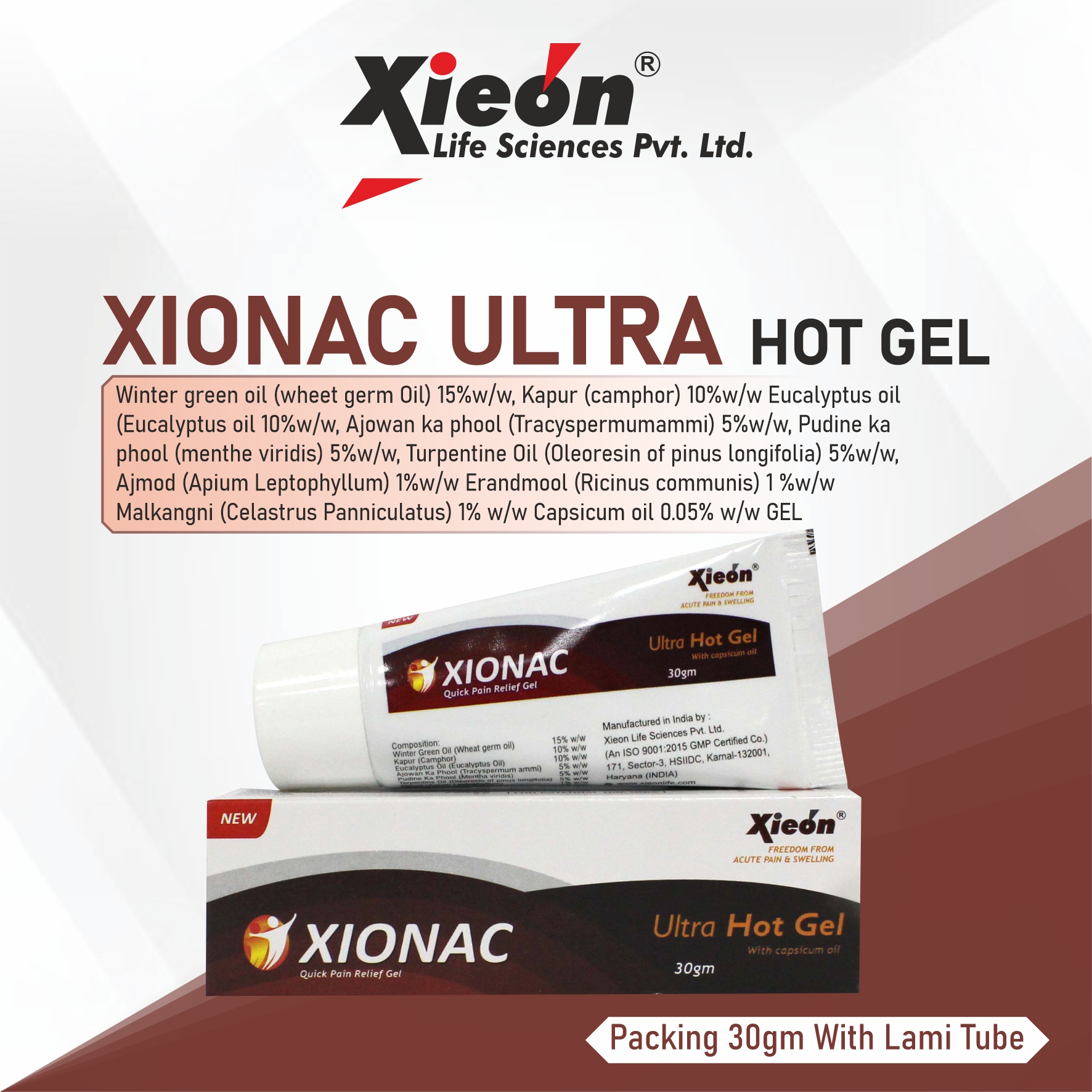 4. XIONAC ULTRA HOT GEL Winter Green Oil (Wheat Germ Oil) 15%w/w, Kapur (Camphor) 10%w/w, Eucalyptus Oil 10%w/w, Ajowan Ka Phool (Tracyspermum Ammi) 5%w/w, Pudine Ka Phool (Menthe Viridis) 5%w/w, Turpentine Oil (Oleoresin of Pinus Longifolia) 5%w/w, Ajmod (Apium Leptophyllum) 1%w/w, Erandmool (Ricinus Communis) 1%w/w, Malkangni (Celastrus Panniculatus) 1%w/w, Capsicum Oil 0.05%w/w